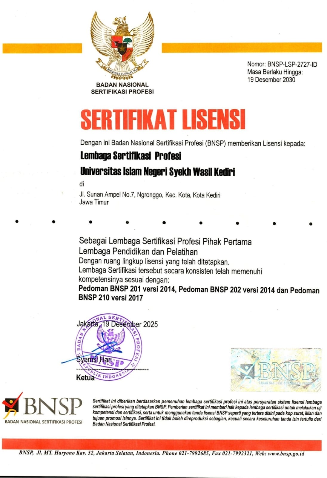 Lembaga Sertifikasi Profesi (LSP) UIN Syekh Wasil Kediri adalah lembaga resmi yang dibentuk untuk menyelenggarakan sertifikasi kompetensi bagi mahasiswa, dosen, dan masyarakat luas sesuai standar nasional dan kebutuhan dunia kerja. LSP ini berfungsi memas